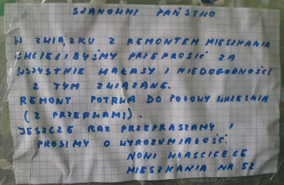 Naszym zdaniem to bardzo dobra, ale niezwykle rzadka praktyka. Dlatego namawiamy wszystkich mieszkańców, aby chociaż w ten sposób informowali swoich sąsiadów o planowanych remontach czy innych zdarzeniach, które mogą okresowo zakłócać im ciszę lub porządek w obrębie piętra czy budynku. Niewątpliwie wpłynie to pozytywnie na nawiązanie lub poprawę sąsiedzkich relacji zaś autorom przedstawionego ogłoszenia dziękujemy i gratulujemy oraz liczymy na naśladowców.